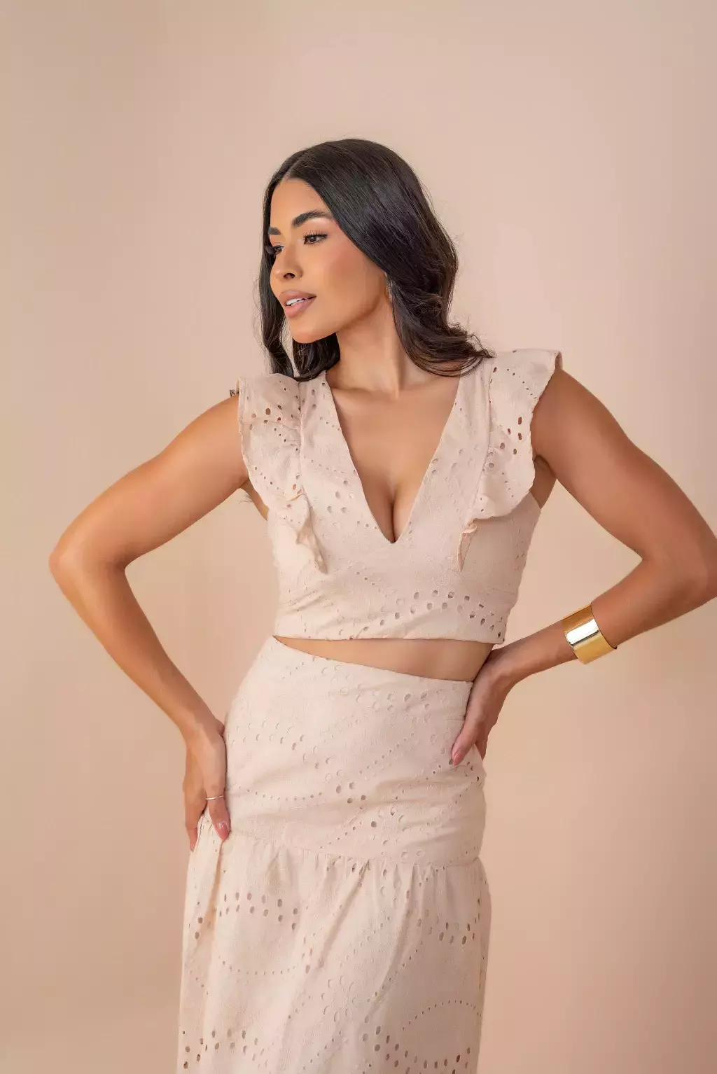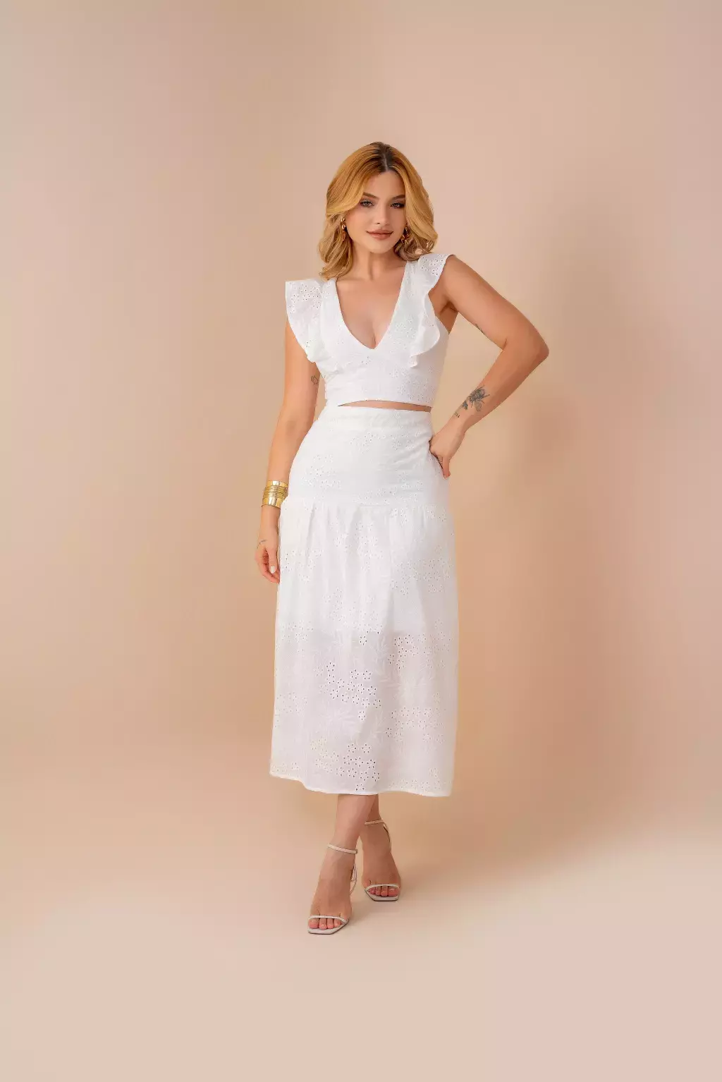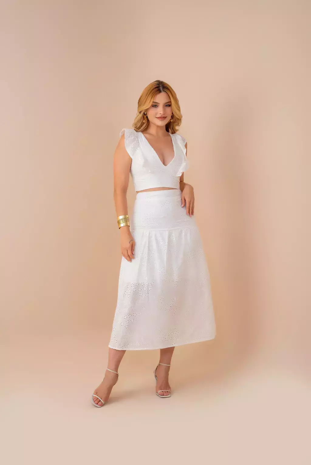 Encante-se com o Conjunto Fany Roupele, a escolha perfeita para quem busca unir elegância e conforto. Composto por um cropped sofisticado e uma saia midi que valoriza todas as silhuetas, essa combinação é ideal para eventos especiais ou para um look casual chic.