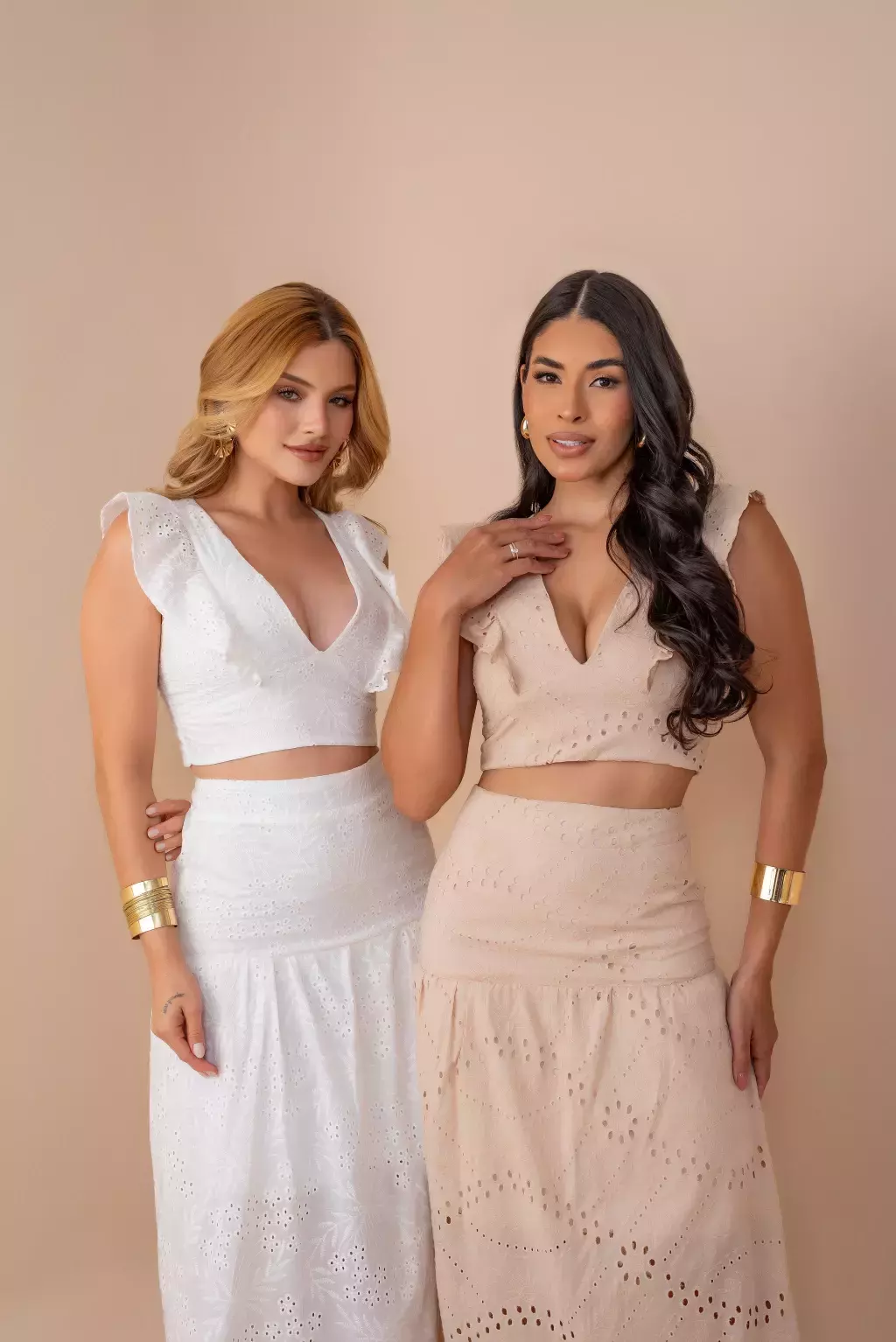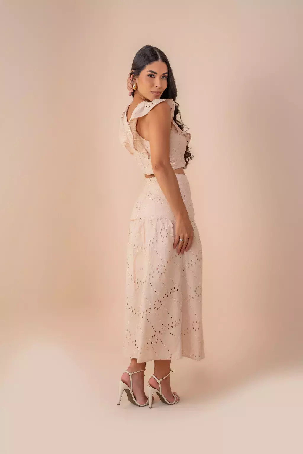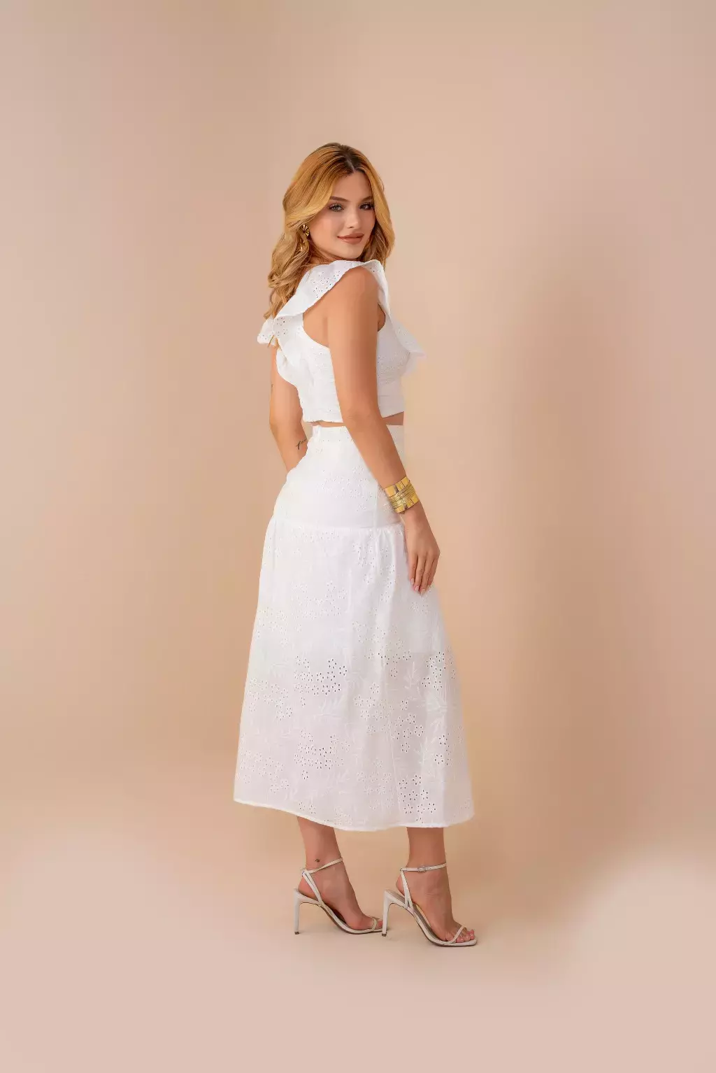 Encante-se com o Conjunto Fany Roupele, a escolha perfeita para quem busca unir elegância e conforto. Composto por um cropped sofisticado e uma saia midi que valoriza todas as silhuetas, essa combinação é ideal para eventos especiais ou para um look casual chic.