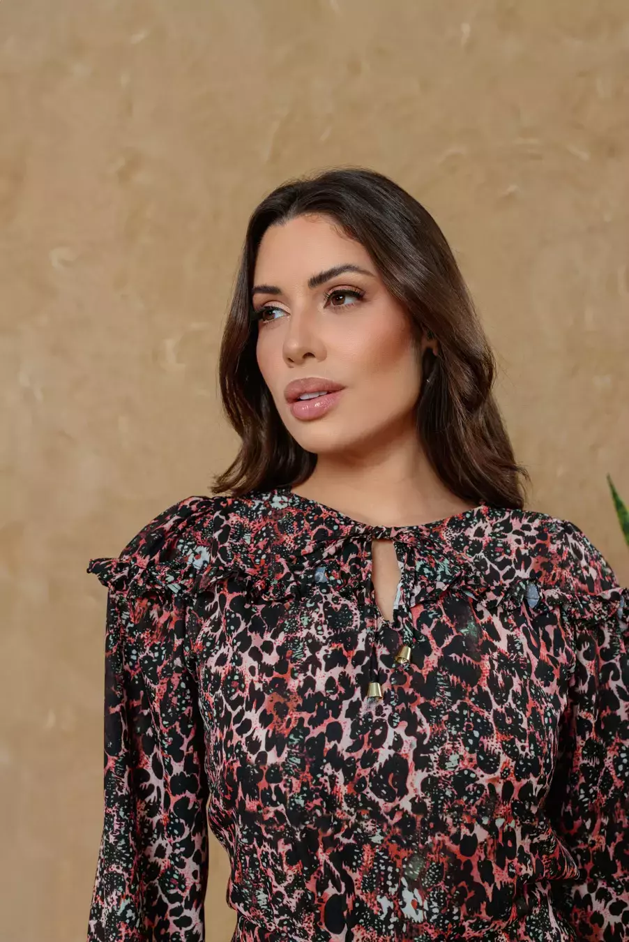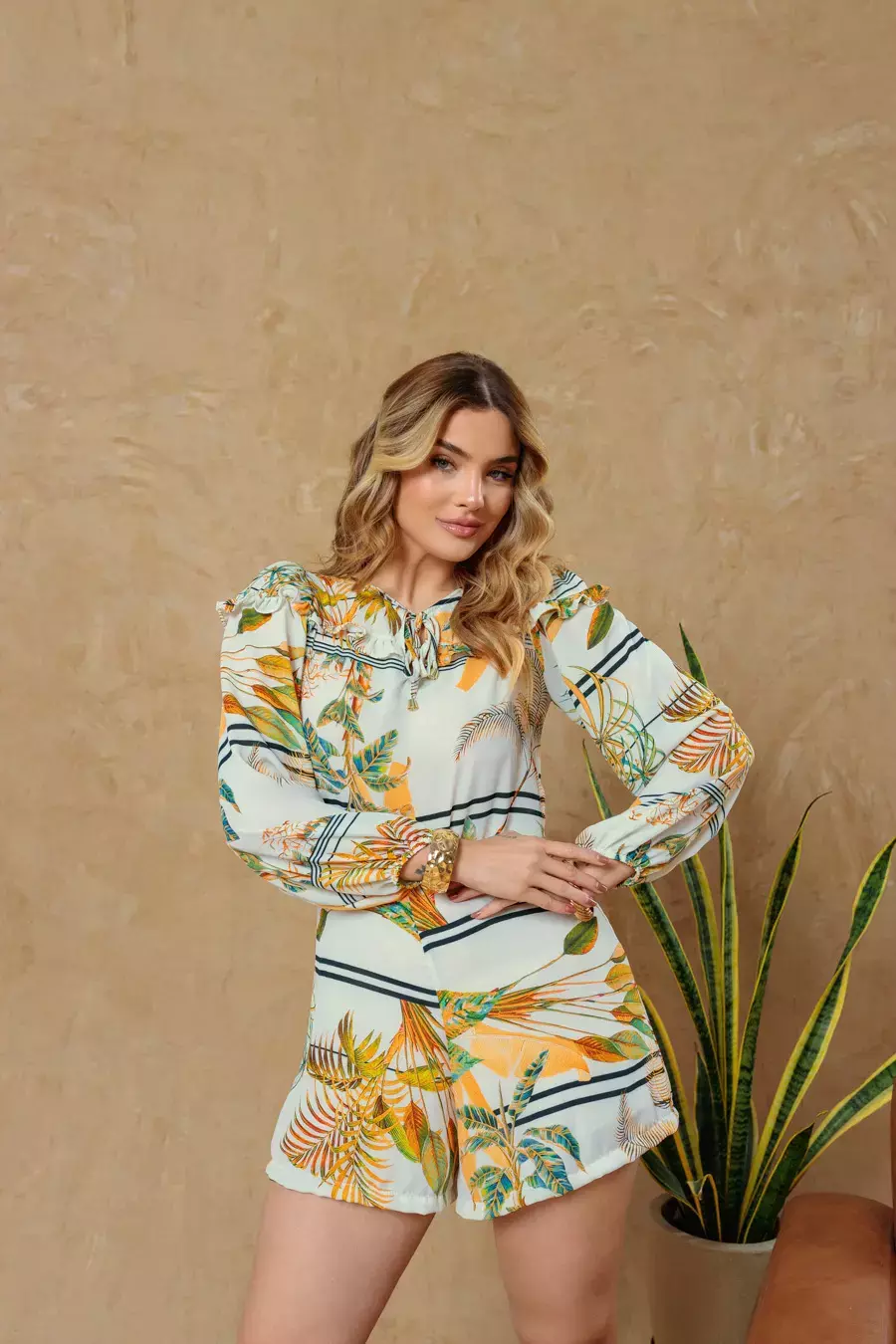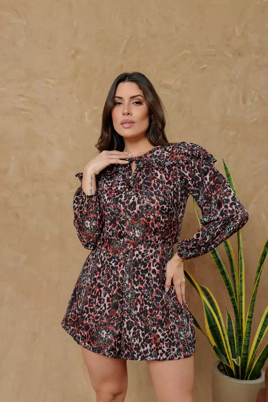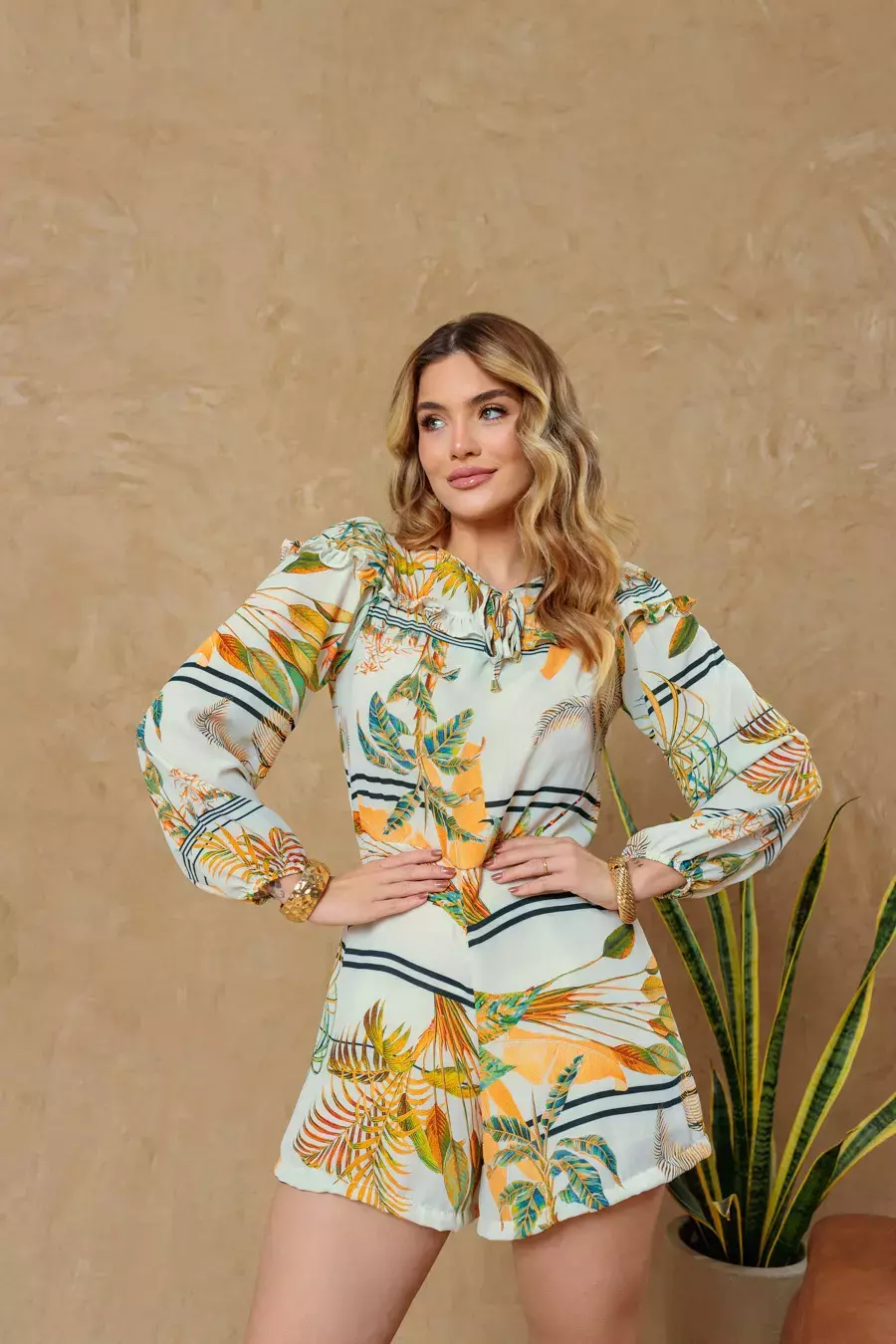 Macaquinho estampado com babadinho ombro, com botões e ziper nas costas.